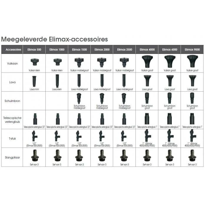 De Ubbink Elimax 4000 word geleverd inclusief aansluitmateriaal en 3 sproeikoppen. Bij de Elimax 4000 zit een vulkaan sproeikop, waterbel sproeikop en een schuimbron. Bij een fonteinpomp moet je goed rekening houden met de grote van je vijver, neem je een te grote fonteinpomp dan zou het water naast de vijver terecht kunnen komen. Voor de Elimax 4000 moet de diameter minimaal 180 cm zijn. De Elimax-fonteinpompen zijn gemakkelijk in gebruik.
